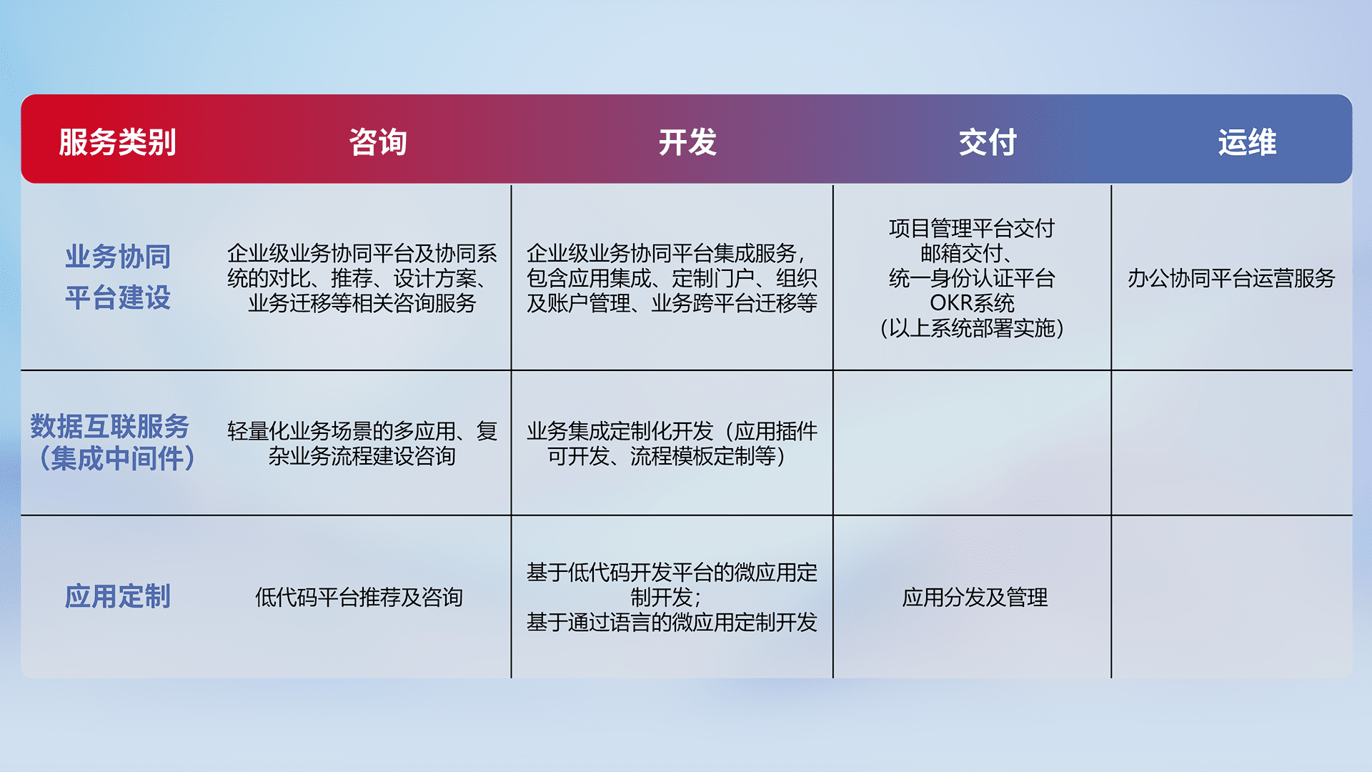 针对钉钉、、、、企微、、、、IDaas等平台级产品提供产品的规划、、方案、、交付、、定制化开发等服务,,,实现如统一协同办公、、、、智能客户服务、、、混合会议管理、、智能数据查询、、、等业务场景,,,,实现数字化转型。。。。