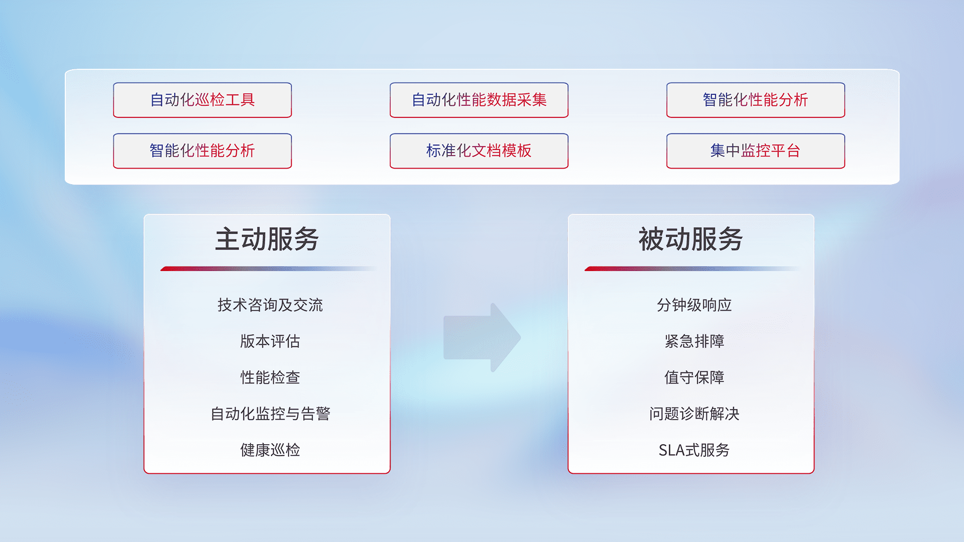 智能化工具和标准化文档,,保障服务质量,,提供主动服务(包含技术咨询、、、版本评估、、、、性能检查、、、自动化监控与告警、、健康巡检)和被动服务包含(分钟级响应、、紧急排障、、、值守保障、、、问题诊断解决、、、SLA服务)。。